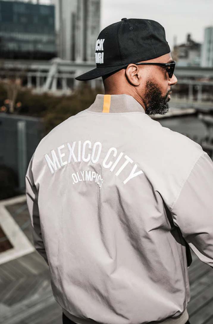 The limited edition Grey Closing Ceremony Bomber Jacket pays tribute to the 1968 Mexico City Olympics with bold archival embroidery and a refined athletic silhouette. Designed in a smooth matte shell with ribbed details, it combines lightweight comfort, structure, and lasting wear. Finished with a Black Safari patch, yellow zipper pull, and standout "MEXICO CITY OLYMPICS" appliqué, this bomber jacket blends cultural legacy with modern streetwear style.