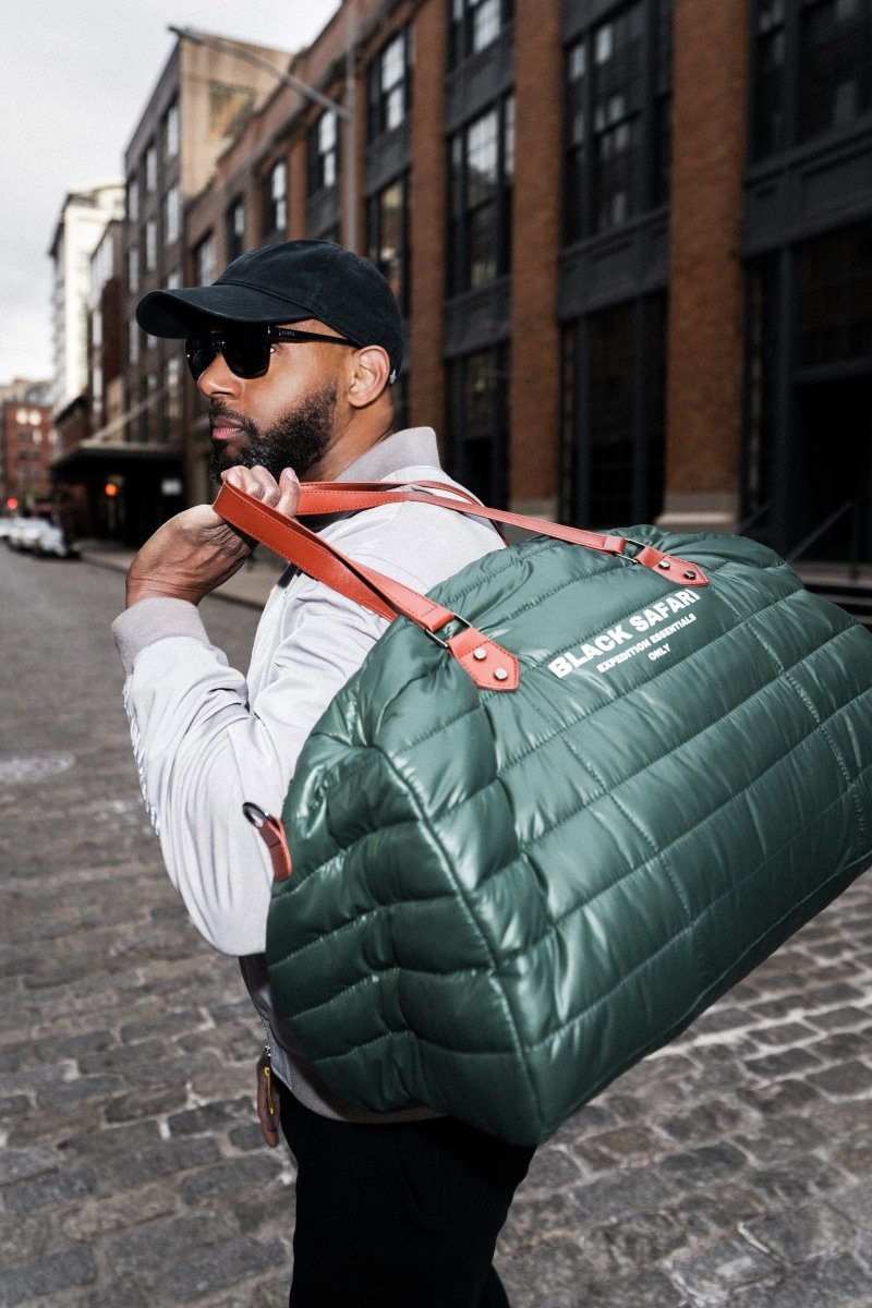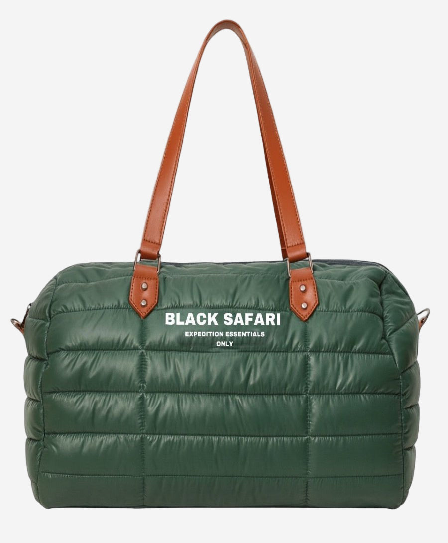 The Black Safari Expedition Duffle was designed for travel and all of your daily pursuits. This waterproof duffle bag is crafted from quilted technical nylon in forest green and features luxurious leather handles, gold hardware, and vibrant expedition branding. The duffel bag is lightweight, but structurally sound. It features a padded shoulder strap and a well-organised interior for easy access and quick packing. Perfect for an overnight trip or ready for cabin carry-on.